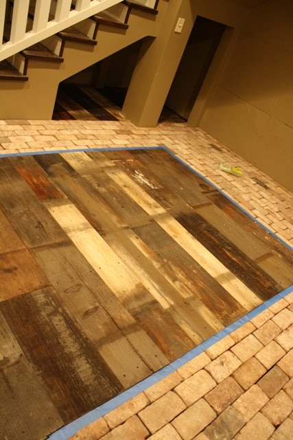 This is the cellar floor (originally a root cellar). The brick we found in the back yard when we bought the house, and the wood is again- our old fence. The hubby spent all weekend putting it down. No easy feat! The boards being so old were a pain to work with. But with much persistence and my constant cheering "you can do it!!" he completed it! How cool is that!! The hubby is nothing short of amazing I tell ya :)