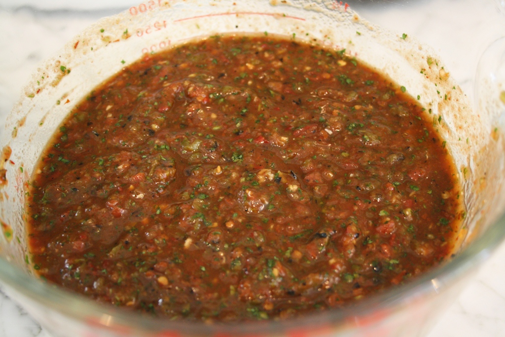 Here's where I throw everything in the food processor.  I work in 2 batches, using half of all the ingredients:  diced tomatoes, cilantro, garlic, chilies, and about 2 tbsp of the chipotle paste. Pulse until smooth.