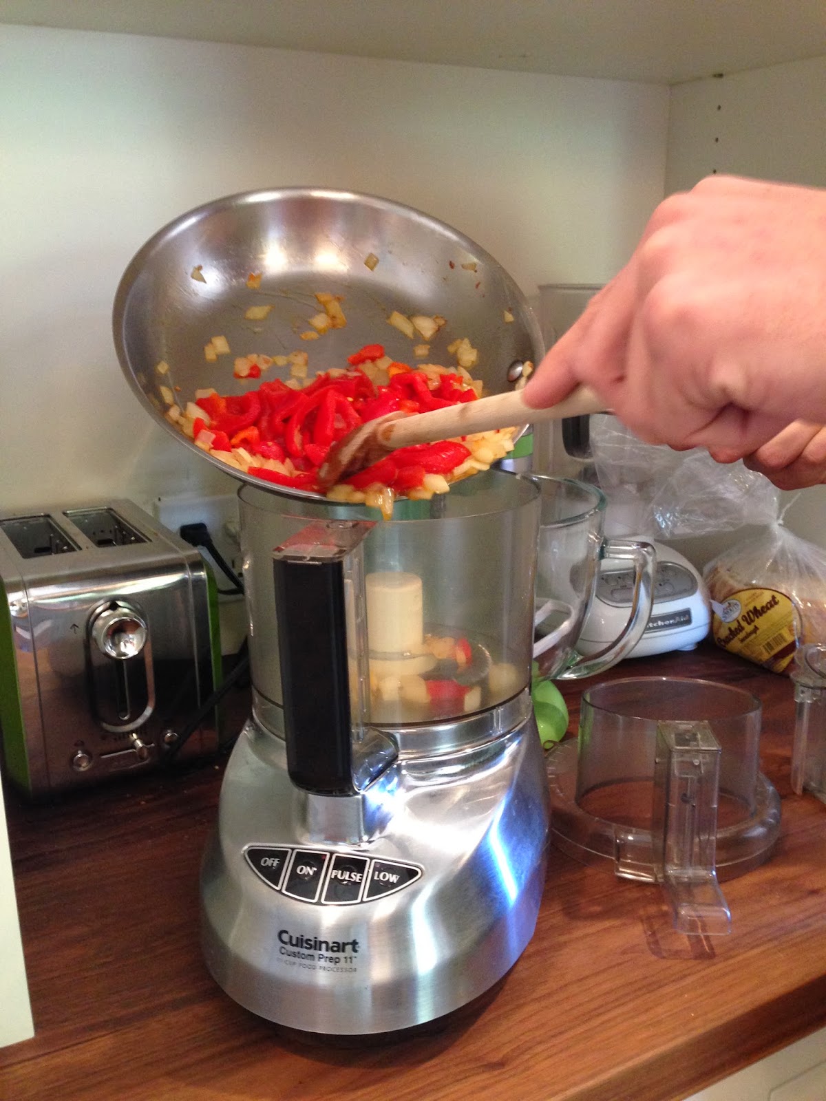 Chop up a half of an onion and a jar of roasted red peppers.